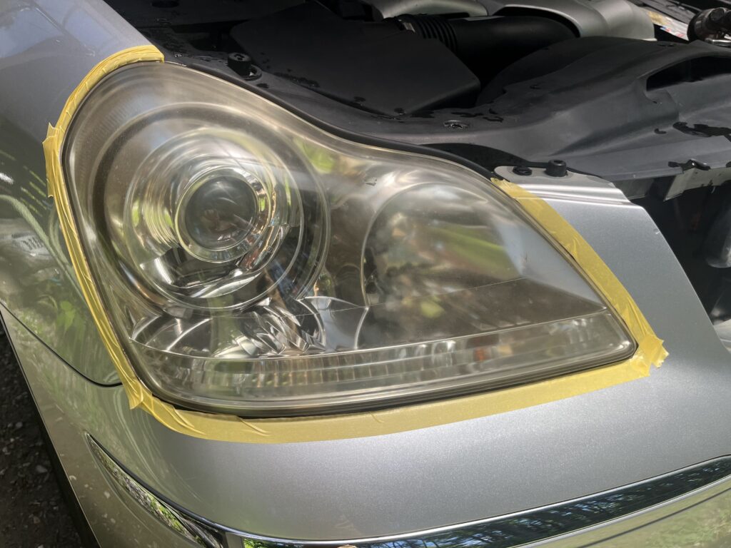 曇ってしまったヘッドライトレンズの透明感を取り戻すための施工です。